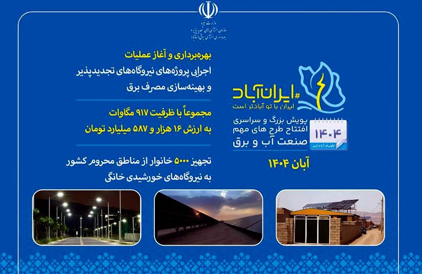 با حضور برخط رئیسجمهور، پروژههای بزرگ نیروگاههای تجدیدپذیر و طرحهای بهینهسازی مصرف برق کشور با ظرفیت ۹۱۷ مگاوات آغاز شد. این طرحها با سرمایهگذاری بیش از ۱۶ هزار و ۵۸۷ میلیارد تومان و با محوریت توسعه انرژیهای پاک، ارتقای بهرهوری و گسترش برق خورشیدی در سراسر کشور اجرا میشوند.